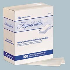 | Dinner Napkins White embossed. Open 15 x 17 folded 4 1/4 x 7 1/2. 1/8 fold. Preference Two PLY 100 napkins per pack 30 packs per case. Dinner Napkins White embossed. Open 15 x 17 folded 4 1/4 x 7 1/2. 1/8 fold. Preference Two PLY 100 napkins per pack 30 packs per case. | Acclaim Hynap Dispenser Napkins Tall fold for small dispensers GPC 500 02 and SAN H900X sold separately . White one PLY. Open 7 x 13 1/2 folded 3 1/2 x 6 3/4. 40 Packs per Case 250 Napkins per Pack | ||